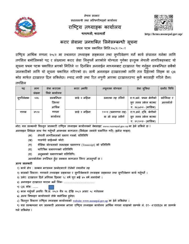 The National Statistics Office invites online applications from eligible and interested Nepali citizens to recruit human resources on a contract basis for conducting field data collection and supervision under the National Economic Census 2082.